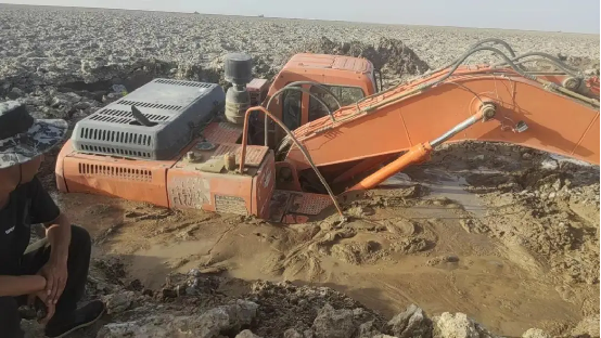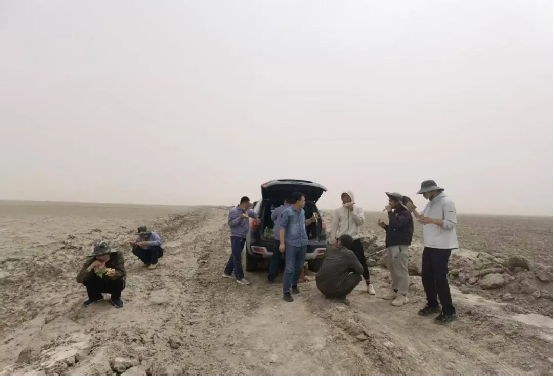 更棘手的是,夏季極端高溫動輒飆升到40℃以上,地表溫度更是直逼50℃,每個人都要扛著沉重的測量設備在松軟的鹽堿地上艱難跋涉,每走一步半腳都要陷入沙中。惡劣的環境下,難解酷暑干渴,有時候全隊只剩一瓶水,大家就小心翼翼地分著喝,餓的時候拿著硬馕,蹲在路邊對付幾口。艱難處境中,有人終究沒能扛住高溫侵襲,出現了中暑癥狀。