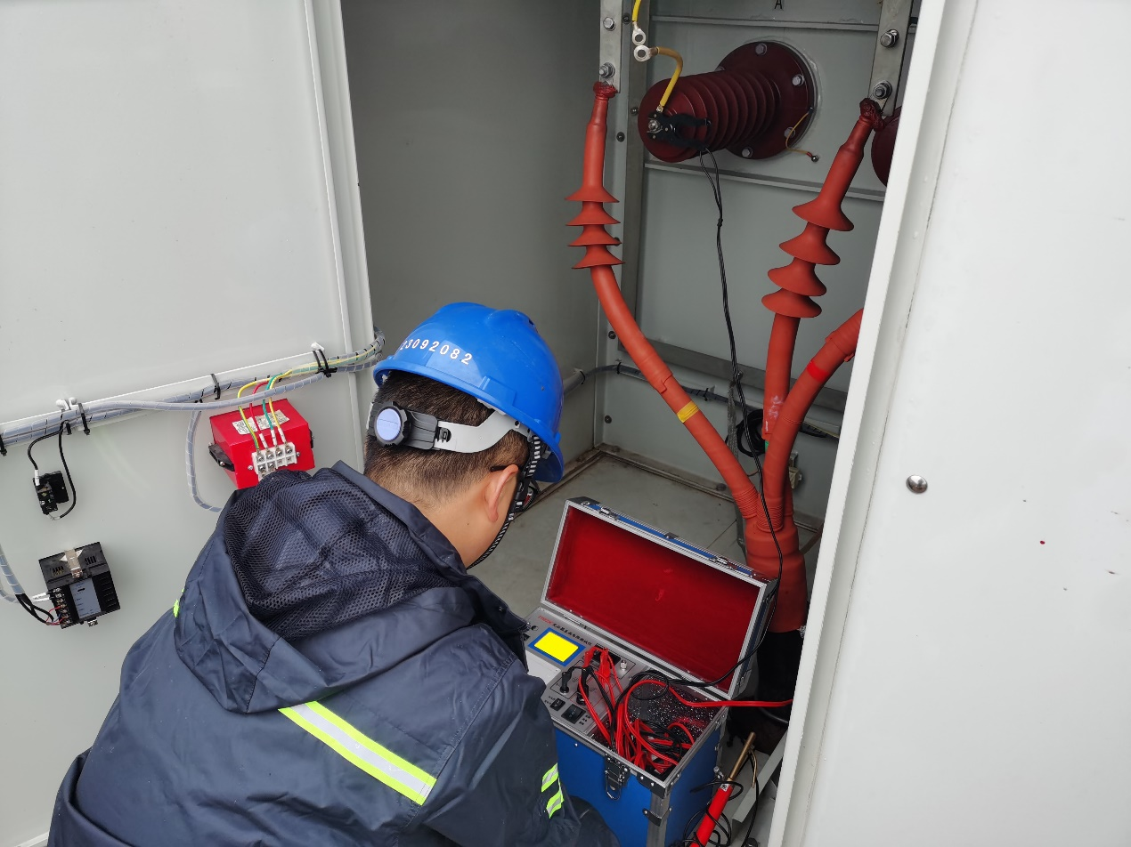 ▲10月3日,中廣核盂縣西煙鎮(zhèn)風光互補電站對026號風機箱變高壓室B相避雷器搶修