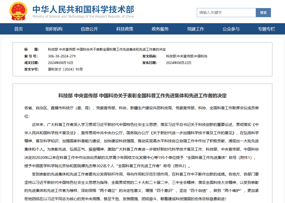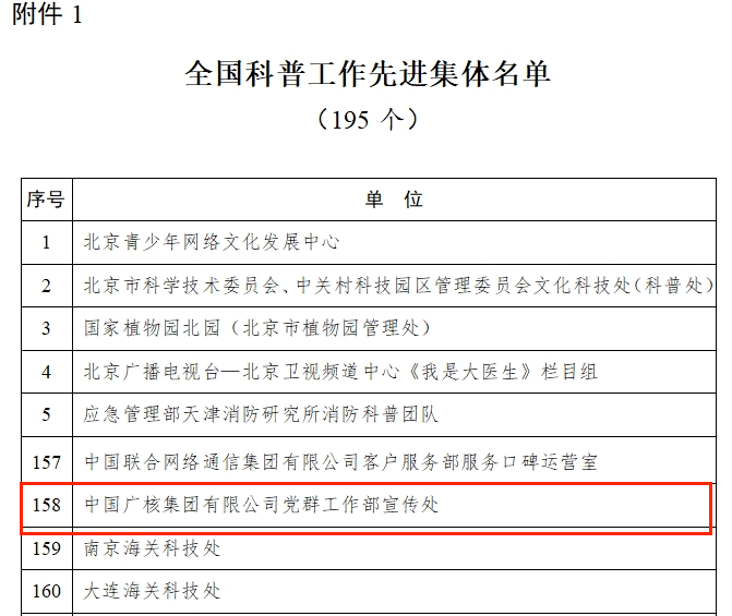 8月22日,科技部、中央宣傳部、中國科協(xié)聯(lián)合發(fā)布《關(guān)于表彰全國科普工作先進集體和先進工作者的決定》(以下簡稱“決定”),對2020年以來在科普工作中作出突出貢獻的195個單位授予“全國科普工作先進集體”稱號。中國廣核集團有限公司黨群工作部宣傳處作為國務(wù)院國資委遴選并推薦的兩家單位之一,榮獲“全國科普工作先進集體”稱號。
