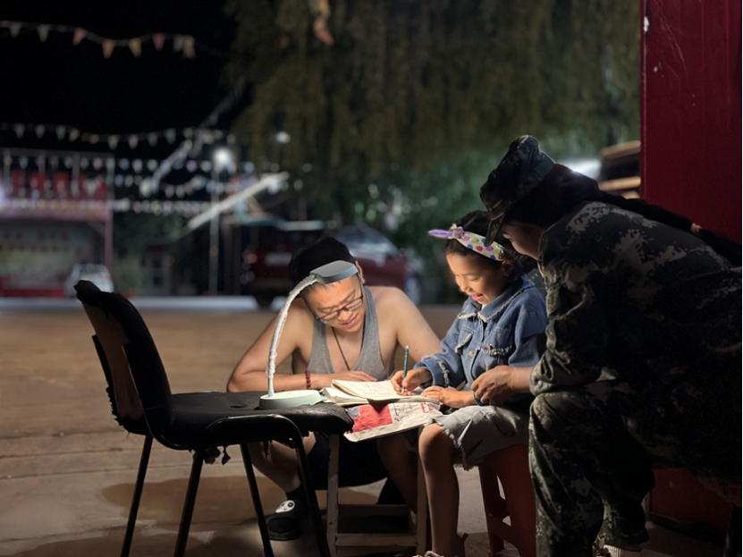 ▲中廣核駐河崖村第一書記梁濤在輔導(dǎo)村里孩子做作業(yè)