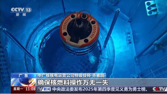中廣核核電運營公司特級技師 喬素凱:我們現在所有的新燃料組件是存儲在新燃料廠房的,通過水下傳輸通道把燃料組件依次傳到核反應堆廠房。